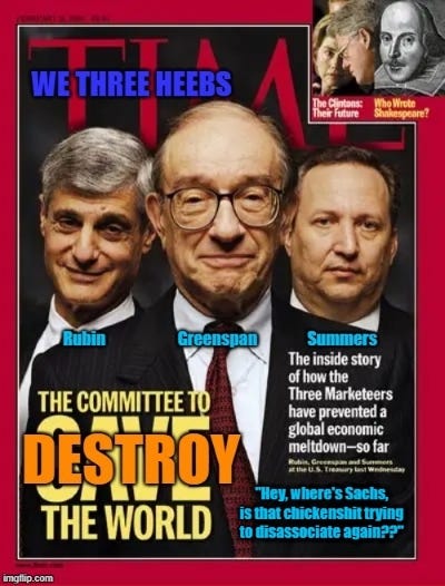 But the larger picture there is the 2008 world economic collapse caused by Wall Street greed and a lack of regulatory policing, neoliberalism's ultimate consequence until the rise of so-obvious oligarchy 16 years later. How much time did Lloyd Blankfein (Goldman Sachs), Ace Greenberg (Bear Sterns), Dick Fuld (Lehman Bros) and Jamie Dimon (JPMorgan Chase) do, all Wall St. CEOs with dirty Jewish fingernails?