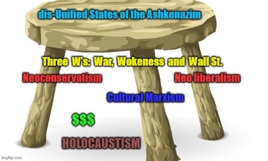 At the end he gets to neoliberalism as a giant fraud and the rise of oligarchy; he says neoliberalism promised much but delivered only mass misery, which also sounds a lot like 20th century communism to me. But then he links neoliberalism to unstated neoconservatism via the goyische Cheneys, which reinforces the false definition of the term, the mirror image of falsely-defined neoconservatism, cleansing both of their true meaning as political philosophies and their ethnic origins as distinctly Jewish.