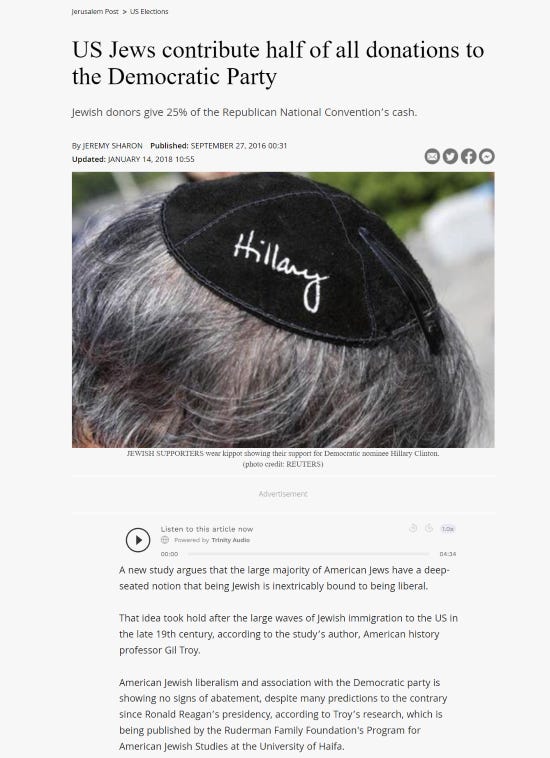 The story in that piece isn’t about overwhelming Jewish campaign contributions overall, it’s about how they are predominately made to the Dem left, Jews “only” contributing a quarter of the money going to the GOP, maybe 20 times a proportional amount to their numbers in that party. That kind of suggests the average Israeli would not at all be surprised that American Jews have bought off the American government.
