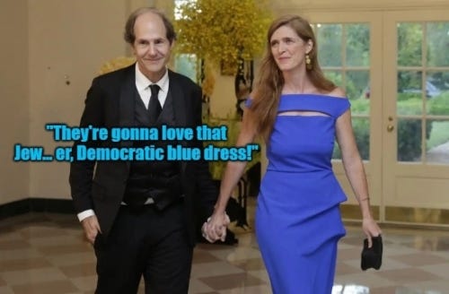 But nowhere there does any of them mention Cass Sunstein, who she married in 2008 after they met while both worked on the Obama campaign. He is her Jewish “AIPAC handler” sharing a bed, just as goys from Kamala Harris to Scott Horton have, and that surely isn’t coincidental related to their public political positioning. Sunstein was a professor of law at the University of Chicago when Obama also taught there, and also served in the first Obama administration.