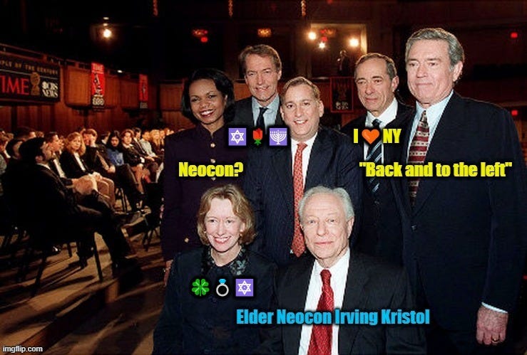 But back to Unz and his history lesson, let’s look at this from the standpoint of the most important neocon Jews. Sachs listed ten in his article which I addresses in my first piece here on substack last September - Leo Strauss, Donald Kagan, Norman Podhoretz, Irving Kristol, Paul Wolfowitz, Robert Kagan, Frederick Kagan, Victoria Nuland, Elliott Abrams and Kimberley Allen Kagan. Five of them are from the Kagan clan. I added eight more neocon Jews to the list in the piece - Bill Kristol, Richard Perle, Douglas Feith, Albert Wohlstetter, John Podhoretz, Midge Decter, Richard Pipes and Daniel Pipes. I could have and perhaps should have added more, like Scooter Libby, David Wurmser, Dov Zakheim, Michael Ludeen. Part of my logic was to underline the first families of neoconservatism - Sachs’ Kagans, the Kristols, Podhoretzes, Pipeses - to show how tight this cabal has really been.