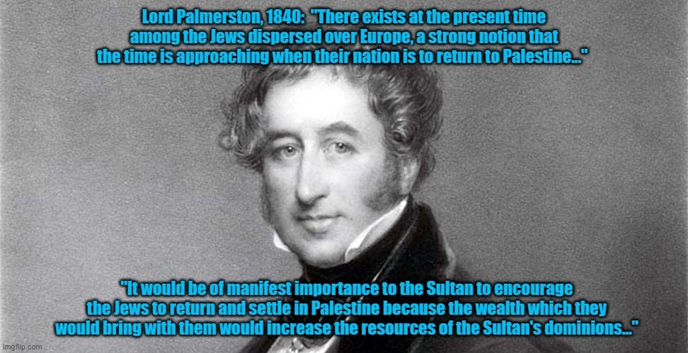 And 1840 was the year that British Lord Palmerston officially acknowledged the Jewish movement of Zionism in Palestine. Most of those Jews lived in Russia.