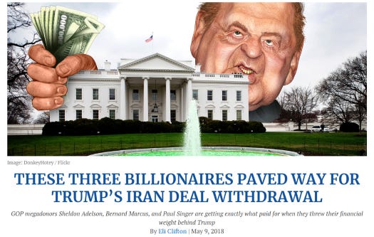 There Scahill lays out the complexity of the situation in the entire middle east and the random chaos going on inside Trump’s brain sitting on top of his divided administration. There is Israel and the power of the Jews in America and neocons inside his White House. There is the powerful attraction of the Arab corporate oil states and their authoritarian sheiks negotiating in a language consisting almost entirely of money. And there is Iran, in different ways the enemy of both, where Trump can end a nuclear deal one day and start one on the next, perhaps based on who he spoke with last. Which is not actually the case - again, it all comes back to who gives the Don his cut, it all comes down to the skim.