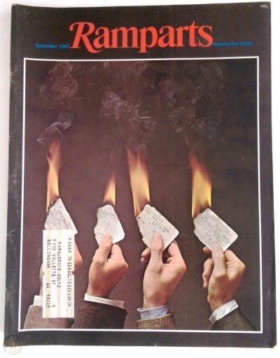 The journal of the New Left was Ramparts, and who were its leading figures? How many of the hands in the below image burning their draft cards were Jewish hands? I can barely read two of them, they are Sol Stern and I think Bob Sheer, and is David Horowitz a third? Maybe Adam Hochschild? It was a fucking Jewfest up in there, at least after they ran Warren Hinkle and his residual Catholic shit out.