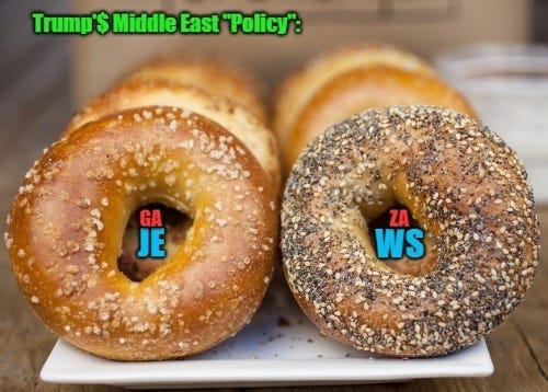 Trump’s “Green New Deal” for the middle east brings us from Qatar right back to the Brooklyn bagel shop, where they specialize in products with holes in the middle, this time bloody Gaza joining the blue boys in essentially being excluded from the conversation.